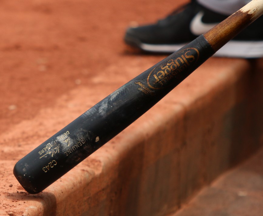Ian Kinsler is swinging a Louisville Slugger C243. Available for customization on Slugger’s awesome custom builder shop many stock options here.