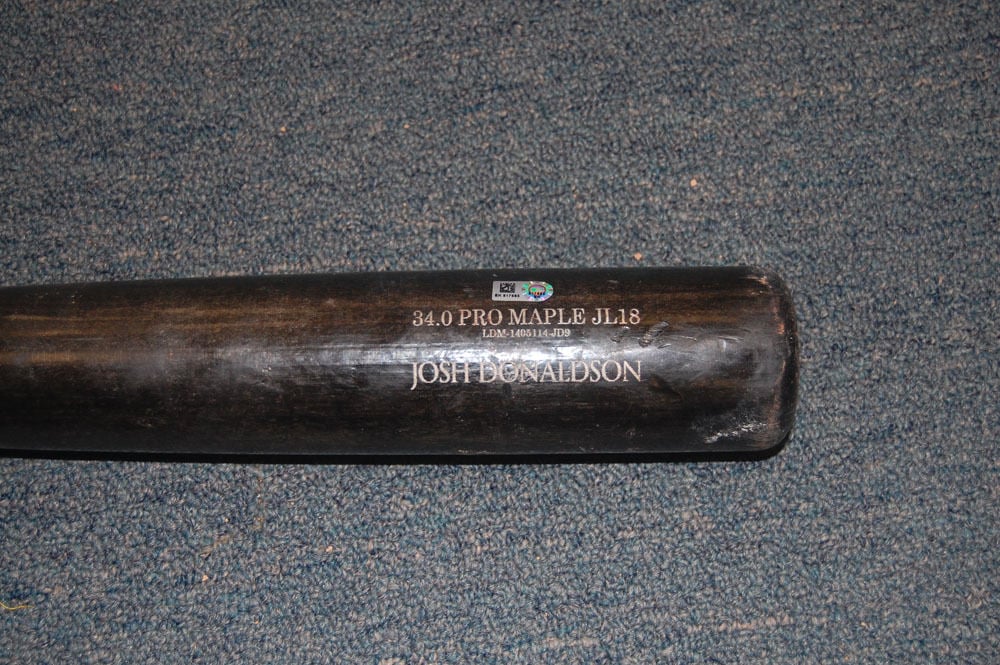 Donaldson often swings a Maple JL18 by Old Hickory. Its a 34/32 just like the Marucci, with a black barrel/unfinished handle and no cup. You can get it at the link. Photo: Tasos Katopodis/Getty Images North America