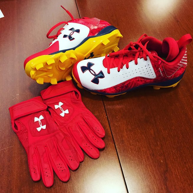 Wong gave us a look at his 2015 playoff exclusives, including these gold/red UA Yard ClutchFit batting gloves, also being worn by Eric Hosmer. His colorway is exclusive, though you can get the Yard ClutchFit style at the link. Photo: @thewongone808