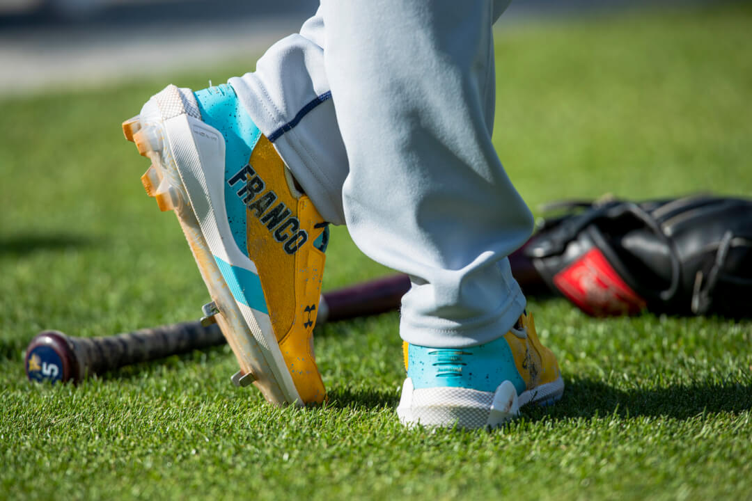 Wander Franco wears Under Armour Harper 6 with custom paint by Lucia Footwear Co. He wore a predominantly yellow pair with “Franco” and “El Patron” (The Boss) on either shoe, with tropical blue trim. In game, he added more tropical flavor and some of the standard Rays navy. This guy […]