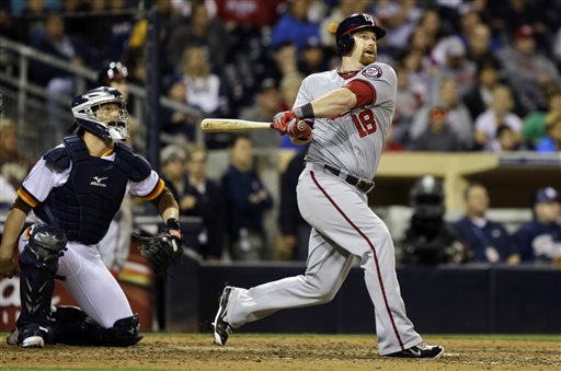 John Baker, a good example of a catcher who uses different brands of gear to complete his set. He uses a Mizuno Pro chest protector and shin guards, an All Star MVP4000, a standard hockey style mask in the Majors, and a Rawlings PROJP20MX glove. Also, how about those ugly Padres jerseys–John Cena anybody? No? Ok. Still very ugly jerseys.