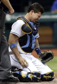 Woah. Looks like Jose Lobaton switched up the catchers gear a bit. First time I’ve ever seen a Rays catcher wear yellow on a protector. Comes from the star in the Ray’s logo. I’ve always thought it would be interesting if a Ray’s catcher that wore an MVP4000 wore a navy primary, a white secondary and then a yellow outline on his gear so he could pull a Koyie Hill and use the third color on his MVP4000. But that still hasn’t happened. Anyway, Lobaton wears a regular All Star set with a CP30PRO protector and a set of LG30PRO shinguards, with a few oddities. First off he is a frontbrimmer, he wears his mask with his skull cap brim pointed out, and second he uses the custom All Star black glove that his teammate Jose Molina also wears. He switched from a regular CM3000 which he talks about in a All Star Youtube video. The photo below is after Lobaton suffered two straight hits to the head area. Caught by a foul tip then the very next pitch getting hit by a backswing. Hope you’re all right Jose, know those don’t feel good.