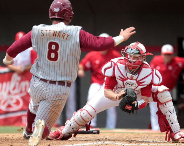 This Oregon State catcher is wearing a set of Nike Pro Gold Shinguards and a Nike Pro Gold Protector. The glove of choice for catchers with sponsorship with Nike or Easton, companies with mitts that are below par for college catchers, is the All Star CM3000SBT 33.5. One example of this is Mississipi State catcher Nick Ammirati who uses Easton gear. He also wears a Nike Titanium mask.