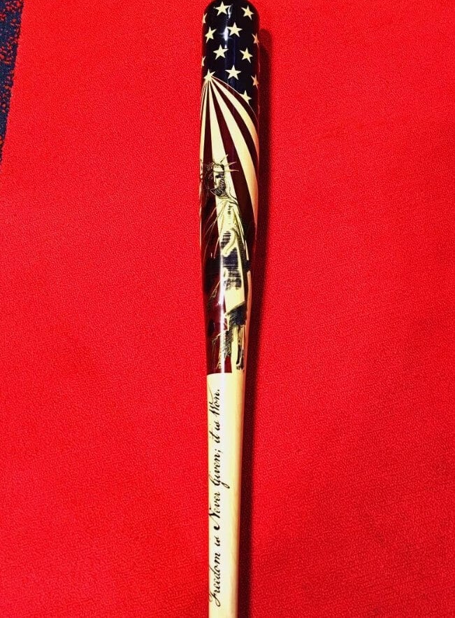 Bryce Harper showed off his take on patriotic lumber, a Statue of Liberty bat that had the words “Freedom is Never Given, it is Won.”