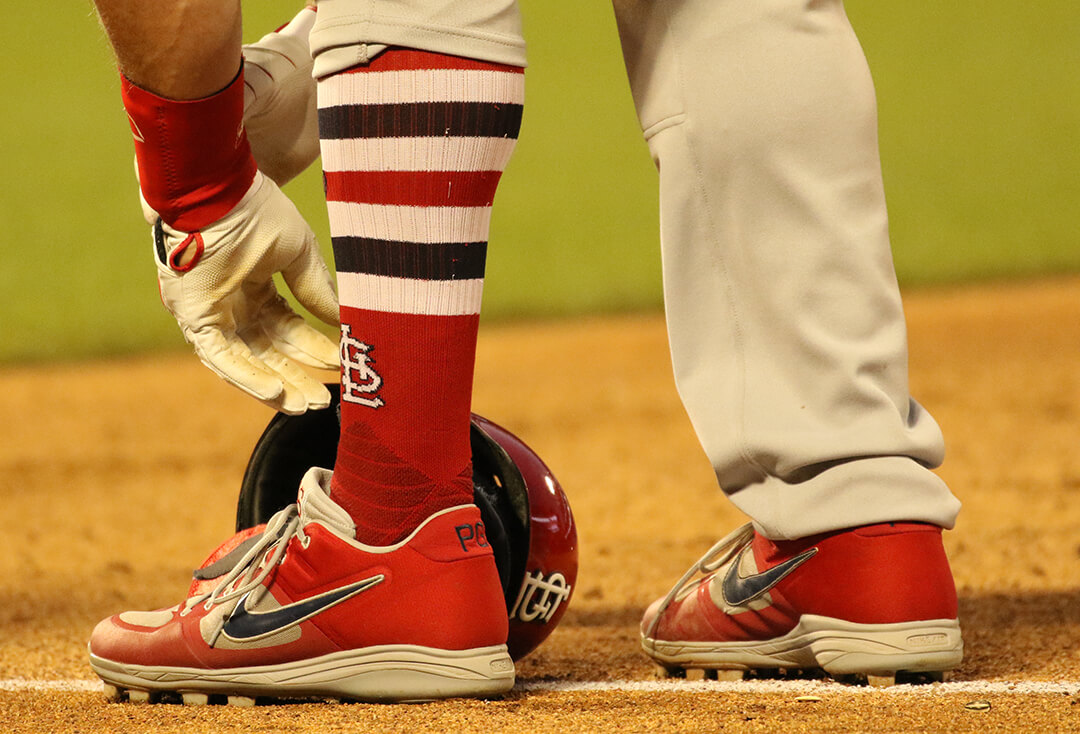 Paul Goldschmidt wears his pants down, but when he pulled off the leg guard we noticed he was rocking the Stance three stripe Cardinals socks underneath. This is strictly a mojo play for Goldy and all fans of the Cardinals should follow suit. Shop for $24 at the link.