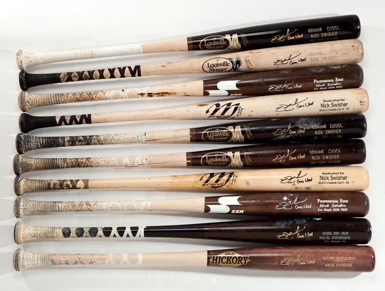 Swisher switches bats often, but most recently we saw him swinging the D195 Prime Maple from Louisville with a cherry handle and a matte black finish. The “Prime” tag is unavailable, but D195 might be found at the link (low quantities).