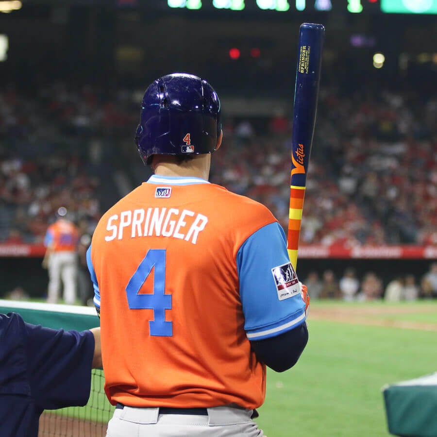Springer swung a gorgeous custom painted Victus bat for Players Weekend 2017. Springer’s is the Axe MB50 (Mookie Betts model), but you can get this look as a JC24 model at the link. What do you guys think about this one?