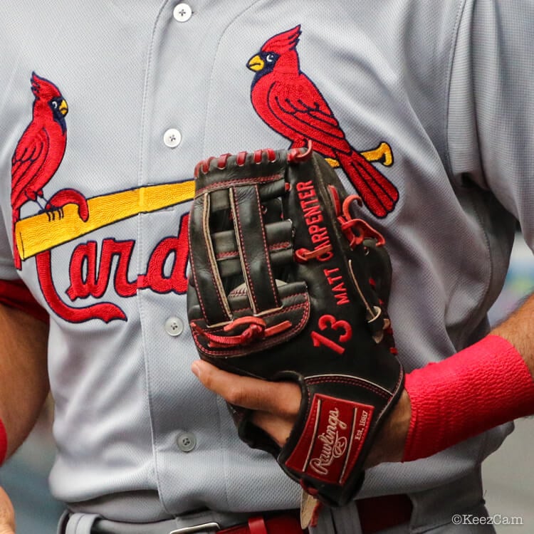 Here are the specifics of Matt Carpenter’s glove straight from the Rawlings Pro Department: 11 ¾” HOH black, #6 H-web, No finger hood. Index finger pad. Carpenter’s glove is available through Rawlings’ custom builder at the UPDATED link.